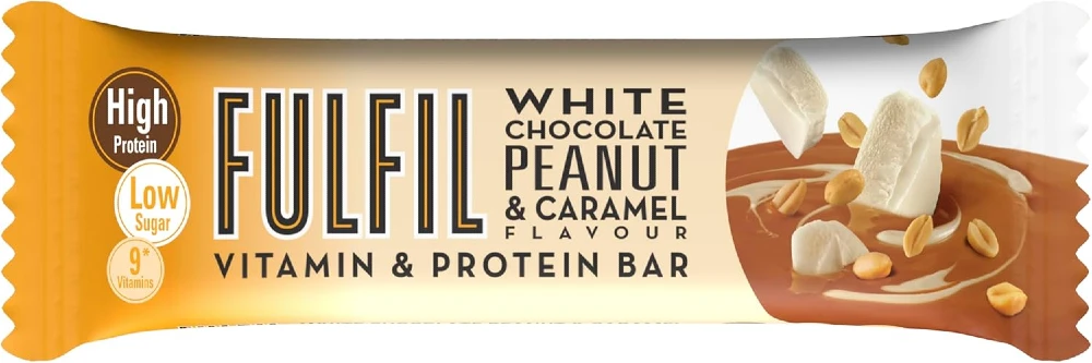 FULFIL witte chocolade pinda en karamel reep met 20 g eiwitten en 212 kcal.